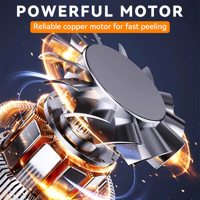 KRAFTIG MOTOR MED KOPPTRÅD – Utstyrt med en høyytelsesmotor med kobbertråd, sikrer denne elektriske skrelleren effektiv og rask skrelling av ulike frukter og grønnsaker. Motoren leverer jevn kraft, slik at selv små frukter skrelles uten anstrengelse uten å stoppe eller tape ytelse. Dens holdbarhet og pålitelighet gjør den til en tidsbesparende tilvekst til ethvert kjøkken.